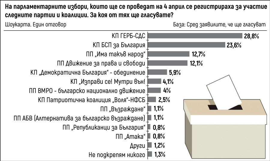 Коалицията ГЕРБ – СДС запазва лидерската си позиция с 28,8 на сто от заявилите, че ще гласуват. БСП е на втора позиция с малко над 5% дистанция от своя основен опонент. Третото място остава оспорвано. Това показва социологическо проучване на Изследователския център „Тренд“, представително за пълнолетното население, проведено в периода 9-14 март 2021 г. по поръчка на „24 часа“.