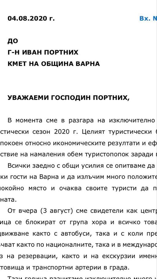 Туристическият бранш реагира гневно на блокадите на ключови кръстовища във Варна от шепа протестъри. В писмо до кмета на морската столица Иван Портних подписано от Георги Щерев, председател на Съюза на хотелиерите от „Златни пясъци“, Марко Марков, председател на Съюза на собствениците за развитие на „Златни пясъци“, Павлин Косев, председател на Варненска асоциация на ресторантьорите и хотелиерите, Илин Димитров, председател на Варненската туристическа камара, Джани Шарков, председател на Варненската асоциация на туристическите агенции, Георги Филипов, председател на Асоциация за реклама и комуникации в туризма и Христина Неделчева, председател на Съюза на екскурзоводите, се казва, че заради блокадите и тяхното постоянно излъчване по националните медии са довели вече до отказ от резервации в хотелите.