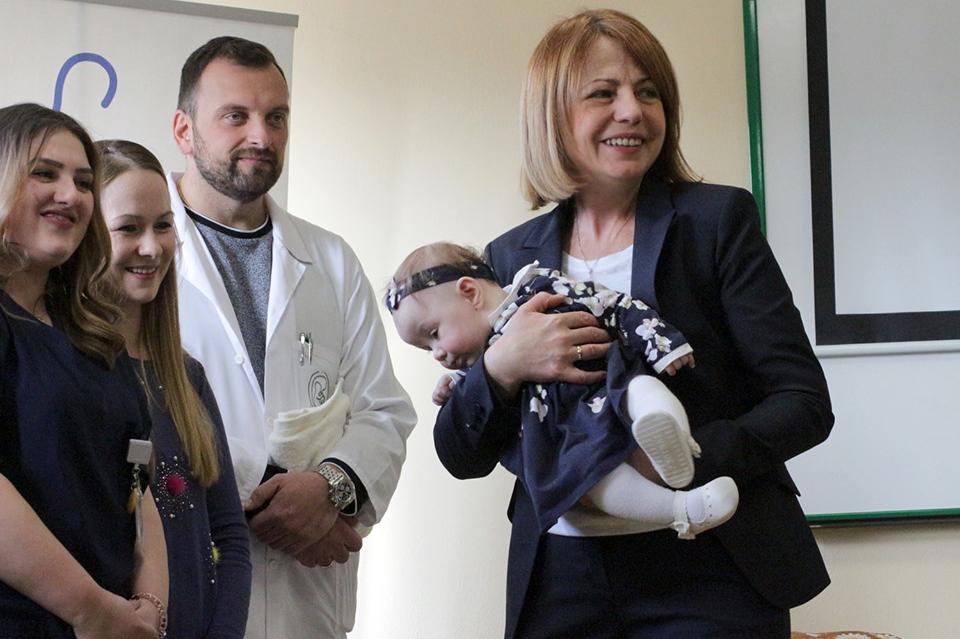 Икона на Света София ще закриля 5-месечната Катрин, майка й Дорина, която също е акушерка, и цялото им семейството. Святото изображение е подарък, който направи Йорданка Фандъкова за бебенцето на празника на родилната помощ, защото красивата майка също е акушерка. Катрин търпеливо издържа на препълнената с емоции и усмивки зала на „Света София“. Всички й се радваха и я закачаха – акушерки, лекари, журналисти и кметове. Мъничето се усмихваше и с ококорени очички търсеше майка си. Дорина е акушерка в общинската болница Първа АГ „Света София“ и миналата година през август роди своята втора рожба. Малката Катрин има и 9-годишен батко, предаде репортер на Столица.bg.