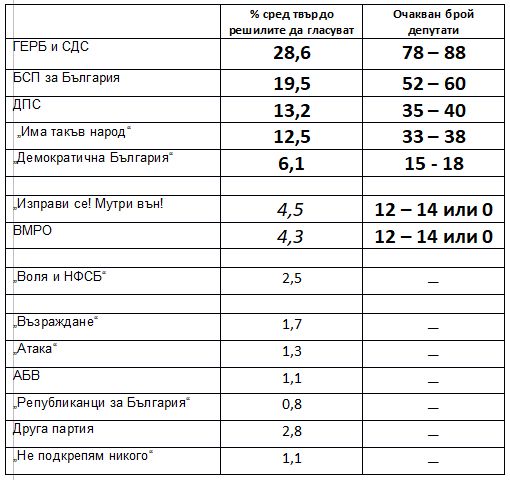 Сред твърдо решилите да гласуват ГЕРБ получава 28.6%, БСП – 19.5%. Трети са ДПС с 13.2%, следва „Има такъв народ“ с 12.5%. „Демократична България“ влиза със сигурност в парламента c 6,1%. Присъствието в Народното събрание на „Изправи се. Мутри вън“ и ВМРО виси на косъм – те са съответно с 4,5% и 4,3%.