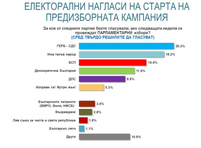 20.3% за ГЕРБ-СДС, с минимална преднина от 2% пред ИТН – 18.2%. Анализът откроява няколко интересни тенденции зад процентите на двете партии, които се борят за първото място. След обявяването на санкциите на САЩ срещу Пеевски и Божков, вотът за ГЕРБ намалява с 2%, което е най-същественият му спад за толкова кратък период. Доскорошните управляващи губят позиции, освен в София, вече и в областните градове. Твърдите им симпатизанти са силно мобилизирани, но по-широката периферия може и да не отиде до урните.