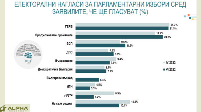 Регулярното тримесечно проучване на агенция Алфа Рисърч, проведено в периода 25 юни–1 юли показва, че ГЕРБ остава първа политическа сила с 21.5%, втори остават ПП с 20.2%.