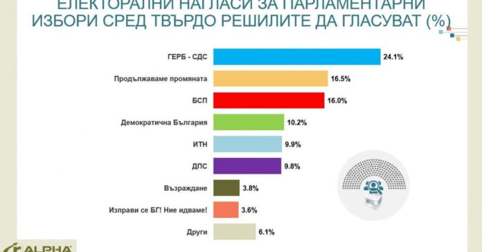 ГЕРБ-СДС запазват лидерското си място с подкрепа от 24.1% от твърдо решилите да гласуват, като увеличават дистанцията пред преките си опоненти. Бившите управляващи успяват да възвърнат част от оттеглилите се от тях през юли избиратели в столицата и големите градове. Преднината им се допълва и от динамичния обмен на симпатизанти между протестните формации, който не позволява на нито една от тях да се открои като безапелационен носител на промяната.