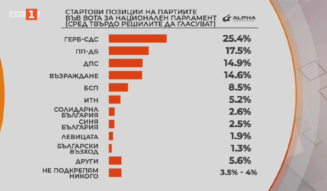 Данните са от последно проучване на „Алфа рисърч“, проведено в периода 25 април – 2 май, реализирано със собствени средства сред 1000 пълнолетни граждани.