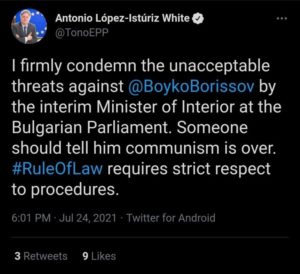 „Категорично осъждам неприемливите заплахи срещу Бойко Борисов от временния министър на вътрешните работи в българския парламент“, написа Антонио Лопес в туитър.