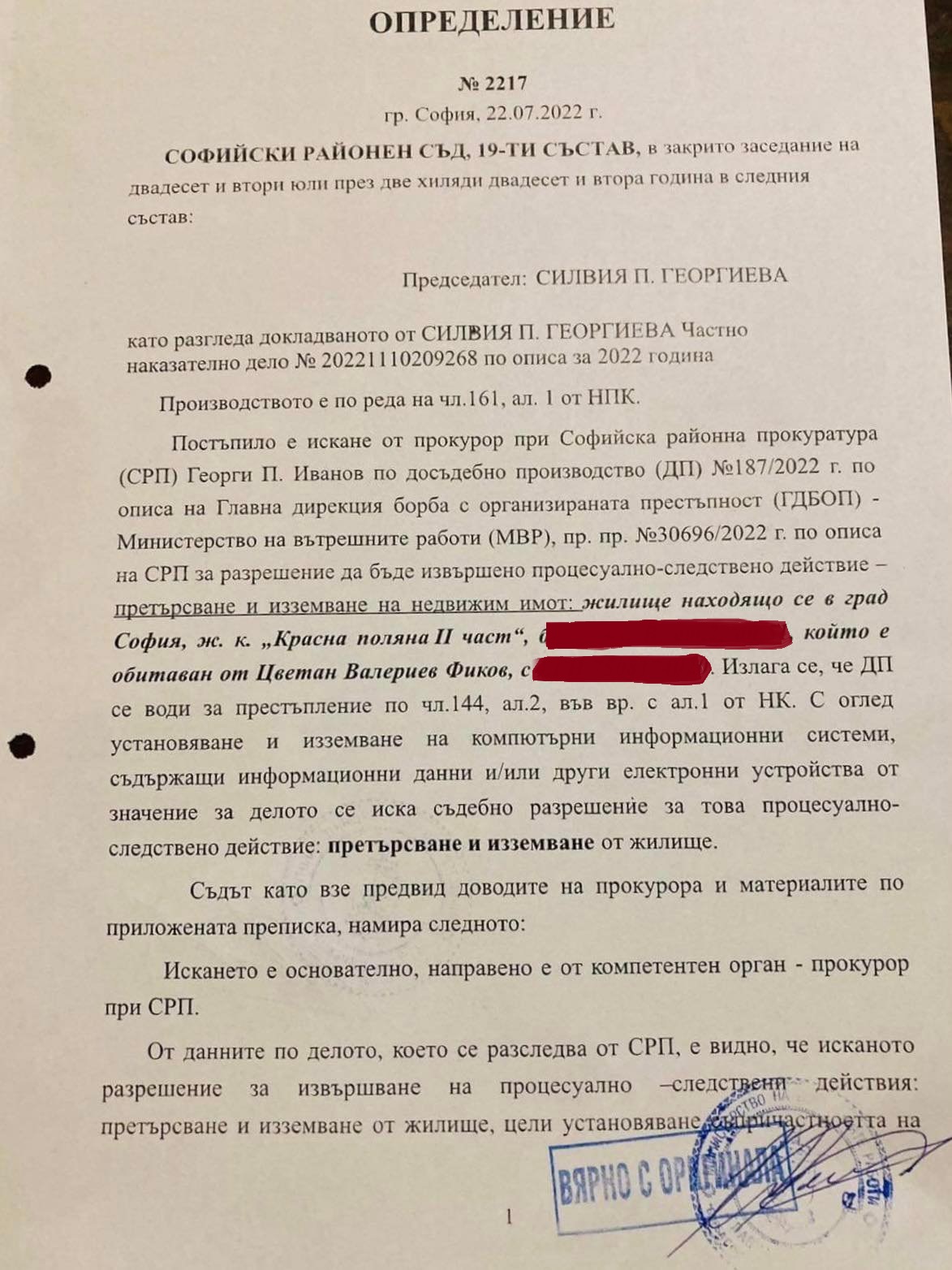 В “определение” #2217 от 22.07.2022 г. , на Софийски районен съд, 19 състав, с председател Силвия П.Георгиева, се казва, че е постъпило искане от прокурора от Софийска районна прокуратура Георги П.Иванов по досъдебно производство … по описа на Главна дирекция борба с организираната престъпност (ГДБОП) – Министерство на вътрешните работи (МВР)… да бъде извършено процесуално-следствено действие – претърсване и изземване на недвижим имот – жилище… “Излага се, че ДП се води по чл.144 ,ал.1, във връзка с ал.1 от Наказателния кодекс.”