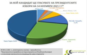 Седмица преди края на кампанията, Румен Радев продължава да заема водеща позиция с 44,6% подкрепа от анкетираните, макар и да търпи леки щети заради ковид мерките на служебното правителство и въвеждането на т.нар. зелен сертификат. Настоящият президент почти със сигурност няма да спечели президентските избори на първи тур и ще участва в балотаж.