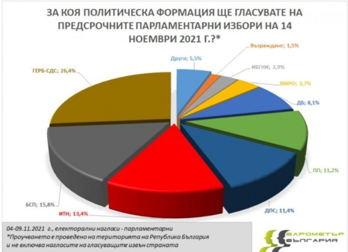 ГЕРБ-СДС остават първа политическа сила с 26.4%, второто място се запазва за БСП с 15.8%. Трети според проучването на „Барометър“ са ИТН с 13.4%, а четвърти – партията на Кирил Петков с 11.2%.
