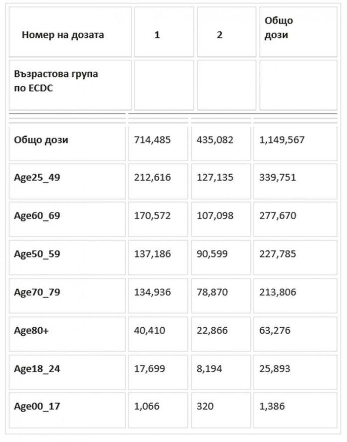 Близо половината от ваксинираните българи са на над 60 г. по данни на Националния статистически институт към 18 май 2021 г. С поставена първа доза ваксина са 345 918 възрастни, или 48.4% от всички ваксинирани, а 208 834 души от тази възрастова категория са със завършен ваксинационен цикъл, т.е. с поставена и втора доза, или 47.9% от всички ваксинирани.