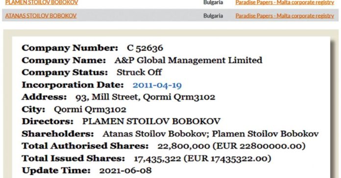 Те имат участие в офшорката A&P GLOBAL MANAGEMENT LIMETED. Офшорката е основана в Малта с регистров номер С 52636 на 19.04.2011 г. Общият обем на издадените акции са 17,435,322 или 17 435 322 евро. Атанас и Пламен Бобокови са собственици на офшорката, а неин директор по документи е Пламен Бобоков.
