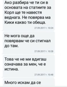 След което получава и есемес от самия Петко Петков със съдържание: „Ако разбера, че ти си в основата на статиите за Корал, ще те навестя веднага Не повярва на Кики какво ти обеща“.