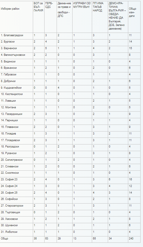 „БСП за България” ще има 36 народни представители, „Демократична България“ – 34, ДПС – 29, а „Изправи се! Мутри вън!“ – 13.