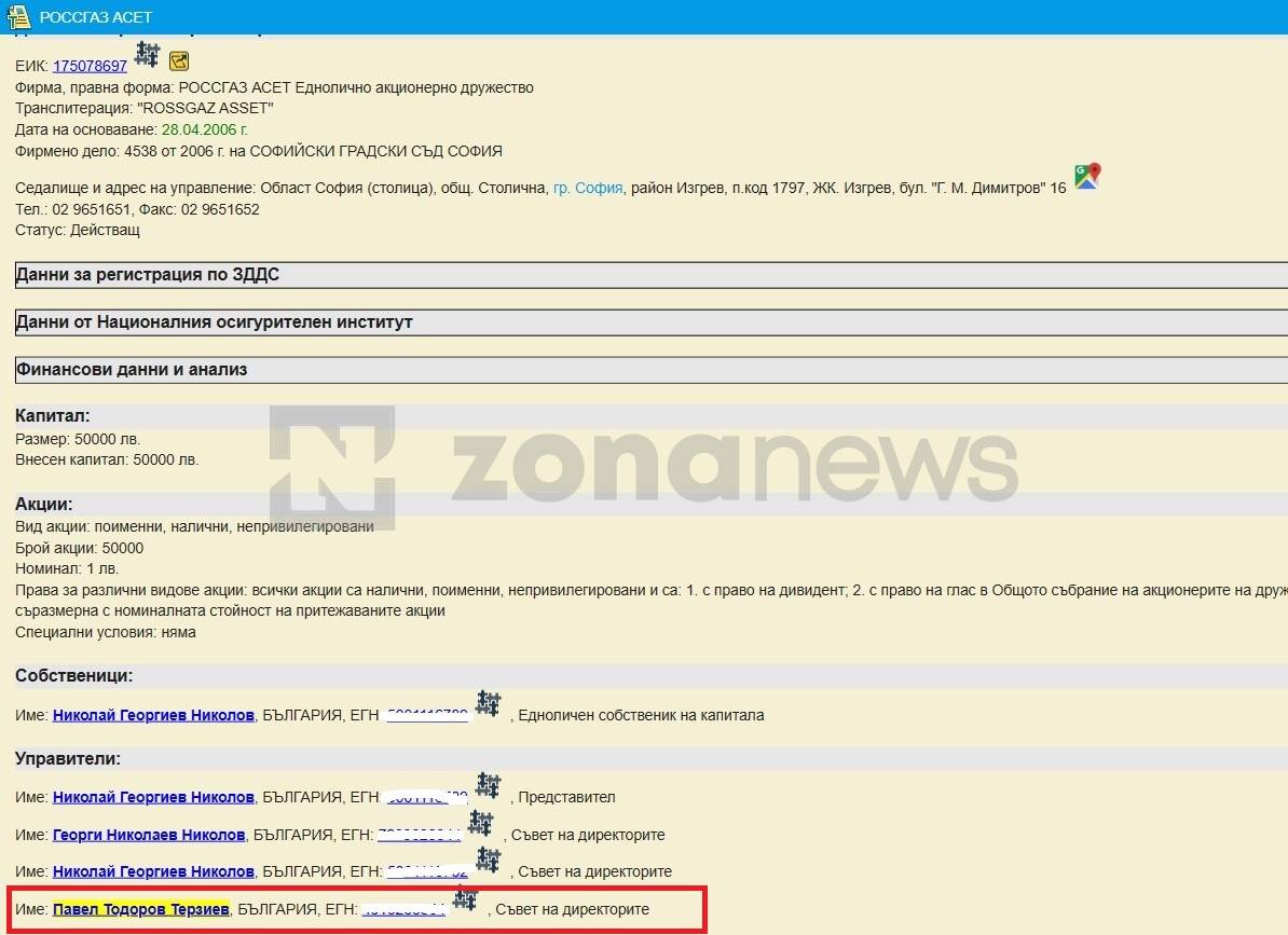 Собственикът е Тодор Петров Стефанов, който също е и собственик на „Россгаз инженеринг“ ЕООД (ЕИК/ПИК 131461936). Павел Терзиев е в Съвета на директорите на „Россгаз Асет“.
