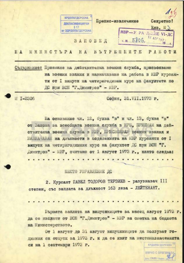 Със заповед № 2306/ 31.07.1973 г. е назначен за разузнавач III степен.