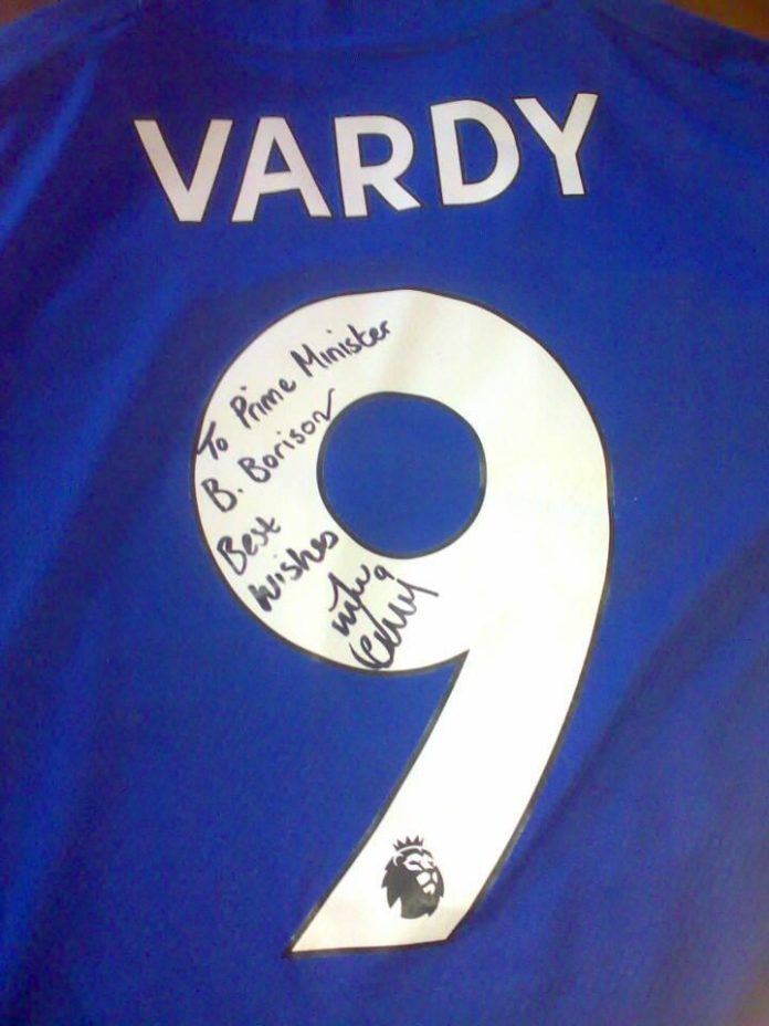 Голмайсторът на английския „Лестър“ Джейми Варди е подарил фланелка с автограф на премиера Бойко Борисов, става ясно от негов пост във фейсбук.
