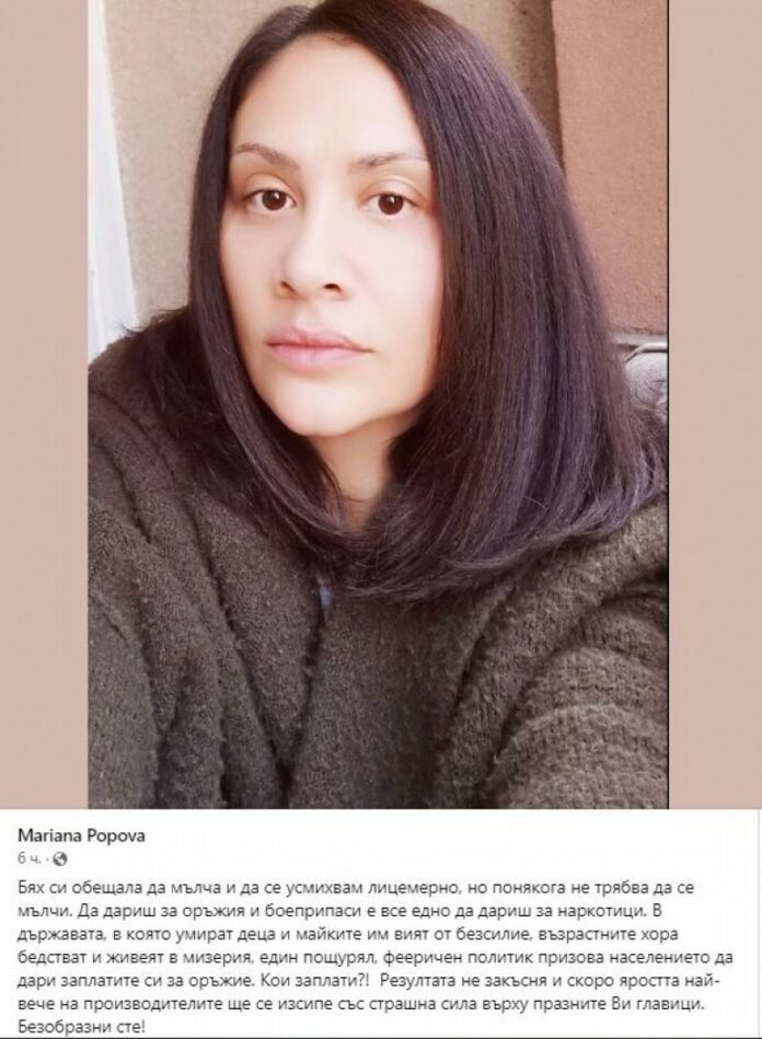 Бях си обещала да мълча и да се усмихвам лицемерно, но понякога не трябва да се мълчи. Да дариш за оръжия и боеприпаси е все едно да дариш за наркотици. В държавата, в която умират деца и майките им вият от безсилие, възрастните хора бедстват и живеят в мизерия, един пощурял, фееричен политик призова населението да дари заплатите си за оръжие. Кои заплати?! Резултатът не закъсня и скоро яростта най-вече на производителите ще се изсипе със страшна сила върху празните Ви главици.
