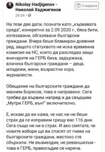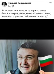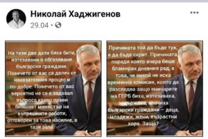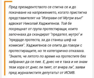Добре, че бяха, както ги нарича Хаджигенов: „еничарите“ от „кървавата сряда“, които „биха, задържаха, влачиха, изтезаваха, обгазяваха български граждани“, за да не остане без перушинка този самовлюбен паун.