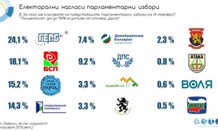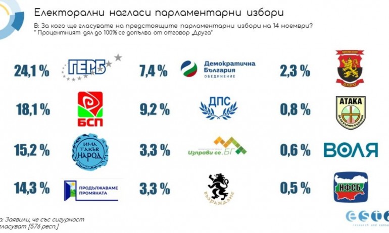 ГЕРБ остава първа политическа сила с 24,1% подкрепа на предстоящите избори. На второ място е БСП с 18,1 %, следвана от „Има такъв народ”, която получава 15,2 % от гласовете. Четвърти са „Продължаваме промяната”, вземайки 14,3 %. ДПС получава 9,2% от гласовете, а „Демократична България” – 7,4 %. Това сочи проучване на агенция ЕСТАТ, проведено в периода 23.10 – 31.10.2021 г. чрез пряко лично интервю сред 993 пълнолетни български граждани. Изследването е финансирано и проведено по поръчка на Дарик радио.