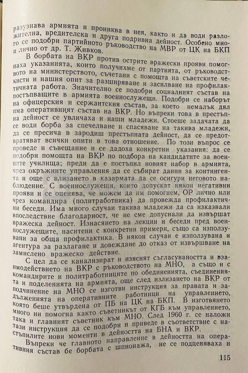 „С цел да се канализират и изяснят съгласуваността и взаимодействието на ВКР с ръководството на МНО, а също и с командирите и политработниците по обединенията, съединенията и поделенията на армията, още след излизането на ВКР от подчинение на МНО се изготви инструкция за правата и задълженията на оперативните работници на управлението, много ни помогна както съветникът от КГБ към управлението, така и главният съветник към МНО“, пише в спомените си Васил Терзиев.