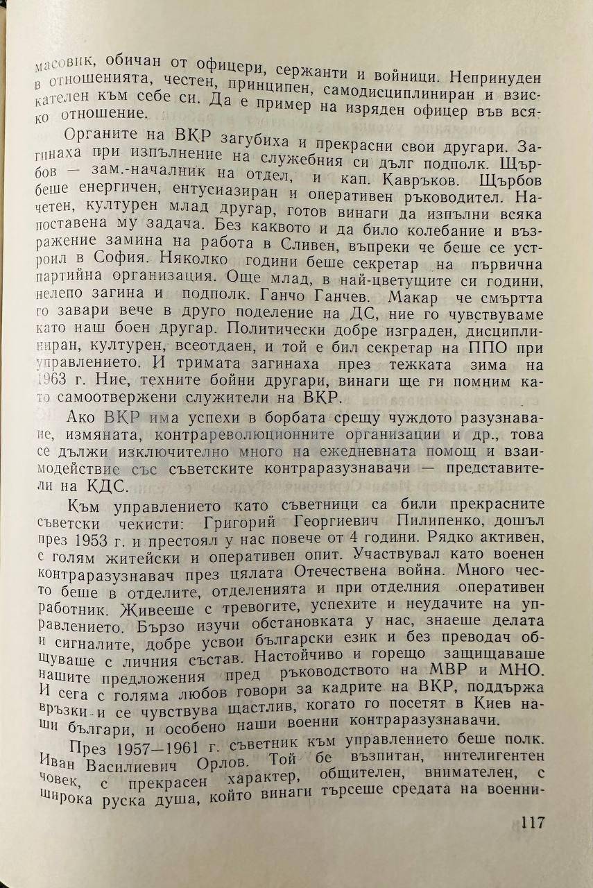„Към управлението като съветници са били прекрасните съветски чекисти: Григорий Георгиевич Пилипенко, дошъл през 1953 г. и престоял у нас повече от 4 години. Рядко активен, с голям житейски и оперативен опит. Участвал като военен контраразузнавач през цялата Отечествена война. Много често беше в отделите, отделенията и при отделния оперативен работник. Живееше с тревогите, успехите и неудачите на управлението. Бързо изучи обстановката у нас, знаеше делата и сигналите, добре усвои български език и без преводач общуваше с личния състав“, пише някогашният шумкарин-терорист.