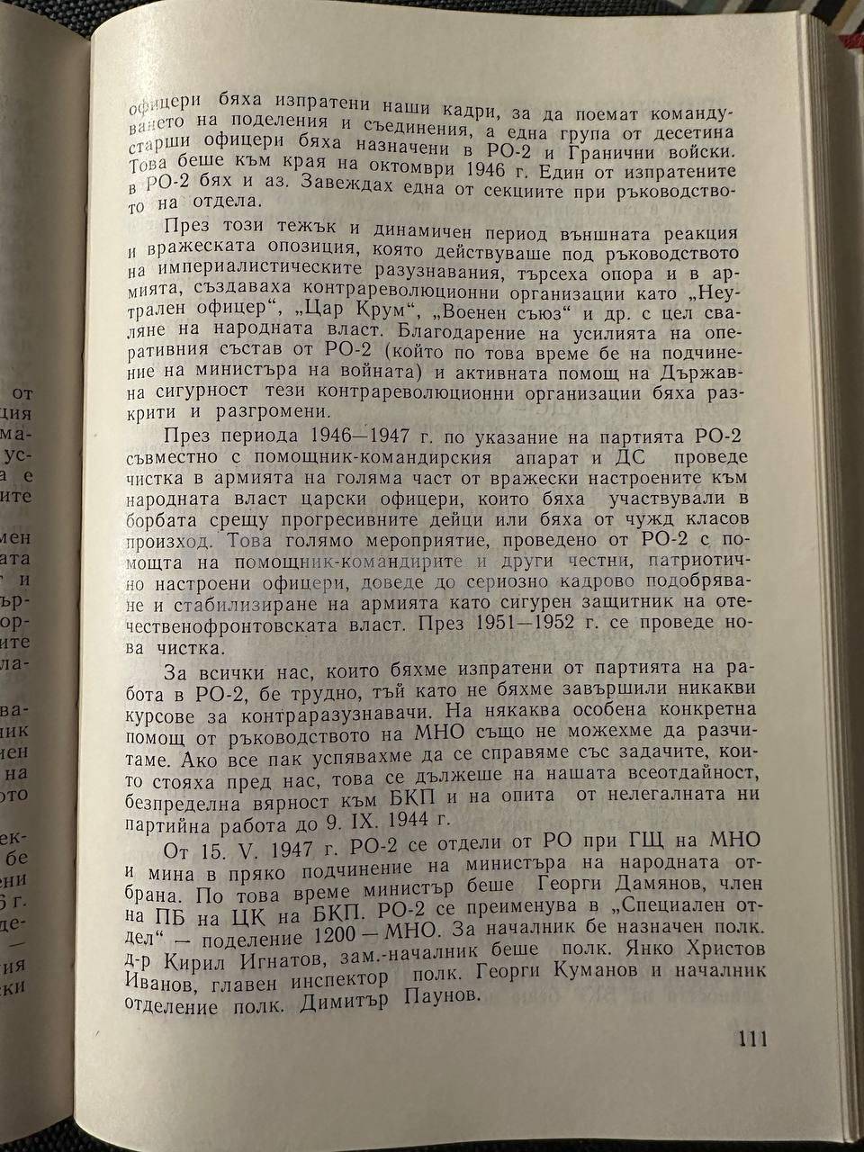 „През периода 1946-1947 г. по указание на партията РО-2 съвместно с помощник-командирския апарат и ДС проведе чистка в армията на голяма част от вражески настроените към народната власт царски офицери, които бяха участвали в борбата срещу прогресивните дейци или бяха от чужда класов произход“. И допълва: „През 1951-1952 г. се проведе нова чистка“.