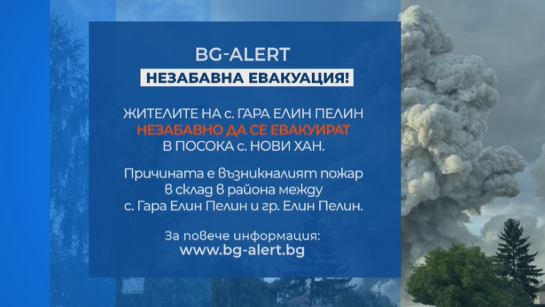 Системата за предупреждения BG-ALERT изпрати съобщение за незабавна евакуация на жителите на с. Гара Елин Пелин в посока Нови хан, сочи съобщението на сайта на системата.