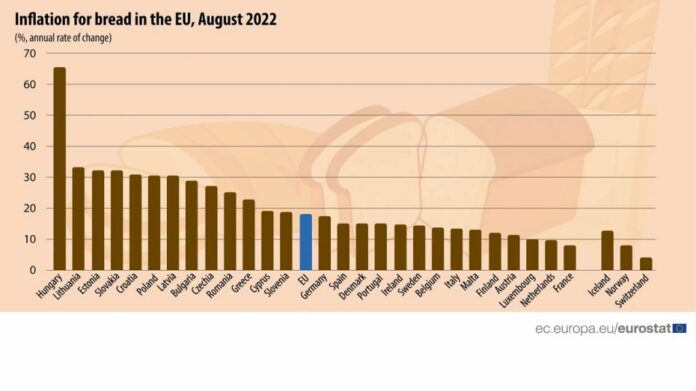 Средната цена на хляба в страните от Европейския съюз през миналия месец е с 18 процента по-висока от тази през август 2021 г., отбелязва статистическата служба на ЕС