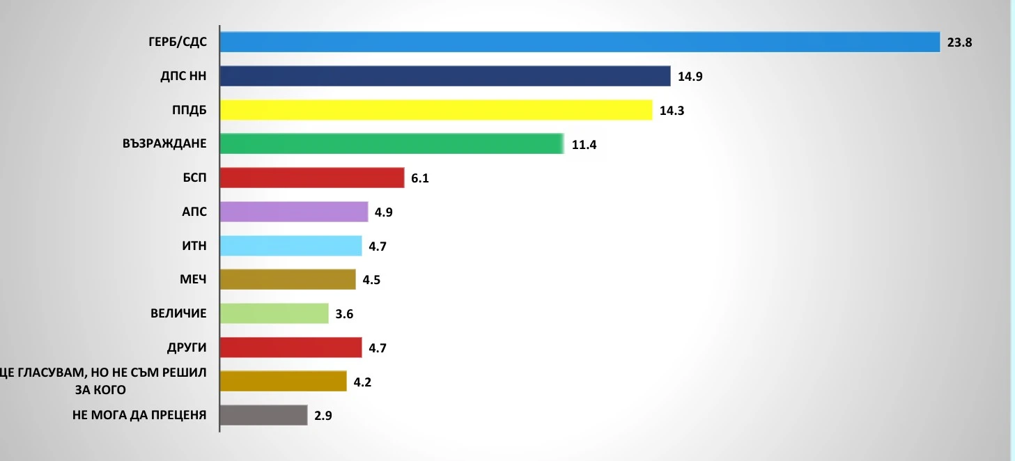 В същото време моментната картина показва известно разместване в битката за второто място, за което след последните парламентарни избори в остра конкуренция и в своеобразен пакет се движат три формации. Към началото на април на втора позиция изпъква ДПС-Ново начало с 14,9%, а непосредствено след тях са ПП-ДБ с 14,3%. „Възраждане“ регистрира спад в електоралната подкрепа и остава на четвърто място към момента с 11,4%.