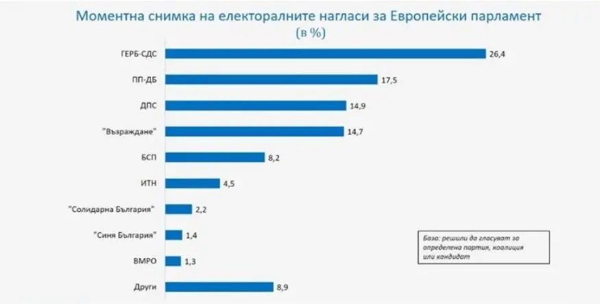 ГЕРБ-СДС биха взели 26,4% от гласовете, ПП-ДБ – 17,5%, ДПС – 14,9%, „Възраждане“ – 14,7%, БСП – 8,2%, ИТН – 4,5%, „Солидарна България“ – с 2,2%, „Синя България“ – 1,4%, ВМРО – 1,3% и други в борбата за процент към този момент.