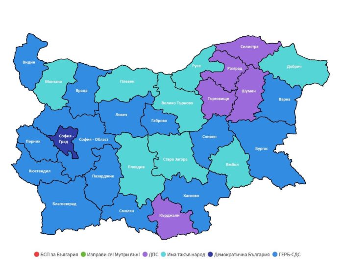 ГЕРБ-СДС са първа политическа сила в 16 избирателни района в страната. Това са 25-и МИР в София, София-област, Пловдив-област, Видин, Враца, Ловеч, Габрово, Перник, Кюстендил, Благоевград, Пазарджик, Смолян, Хасково, Сливен, Бургас и Варна.