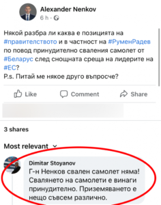 Главният секретар на президента Димитър Стоянов, популярен като Митко Есемеса, защити позицията на президента на Беларус за принудителното отклоняване и приземяване на самолета в Минск по редовния полет на Ryanair от Атина за Вилнюс. Това стана ясно от негов коментар под пост на Александър Ненков от ГЕРБ.