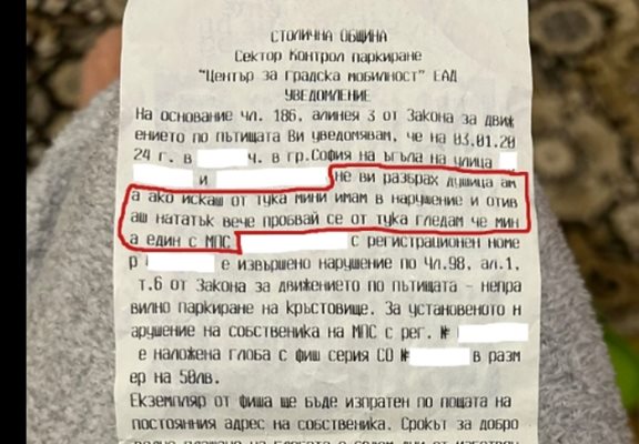 ЦГМ налага глоба с фиш със следното съдържание: „… не ви разбрах душица ама ако искаш от тука мини имам в нарушение и отиваш нататък вече пробвай се тука гледам че мина един с МПС….“. Малко ми изглежда като служителят на общинското дружество да си е чатил с някое гадже и леко да се е объркал дали пише в чата, или в системата за налагане на глоби. Не разбирам как при това положение шофьорът би си платил задължението. Разбира се, това е нелепо и показва само малка частица от проблемите в ЦГМ, които сегашният съвет на директорите и изпълнителен директор не могат да решат.