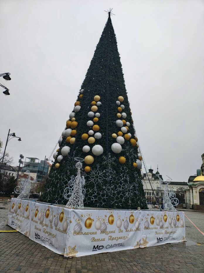 Имаме най-опасната и абсурдна елха в София, обвита с мушама и облепена с фирмено лого на строителна фирма.