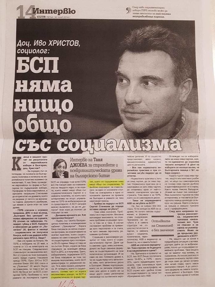 В този смислов ключ, нека припомним едно интервю на Иво Христов от 2014 г., което напълно обезсмисля днешните му нескопосани опити да адвокатства на БСП и да я описва като социална, национална и т.н. партия.
