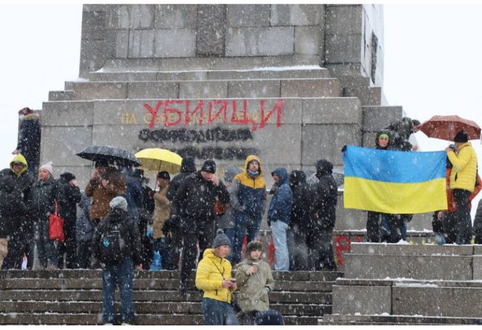 Неизвестни художници са изрисували Паметника на Съветската армия в цветовете на украинското значе. Надписите върху монумента са свързани с действията на Русия и на президента Путин на територията на страната, съобщава stolica.bg