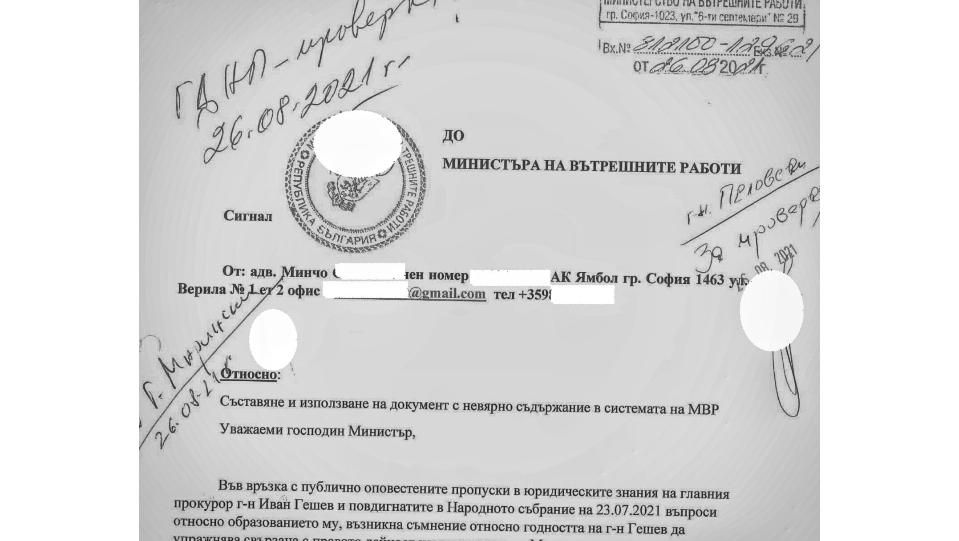 Забележителна е и скоростта, с която МВР се задейства по сигнала на Минчо Спасов срещу Иван Гешев. На 26 август миналата година ямболският адвокат подава сигнал до служебния вътрешен министър по това време Бойко Рашков. Още същият ден върху сигнала са поставени три резолюции, с които се ангажира ресурс на МВР да проверява диплома за юридическо образование, издадена преди повече от 25 години.