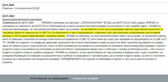 Нов съдебен документ по делото на Бретшнайдер за Чаталджа разкрива, че той е отпуснал заем на „третото лице“ през 2019 г., когато СТВКонсълтинг е взела първия си банков кредит от 2,8 млн. лв. Към този момент СТВ още е собственост на АсенВасилев. Но дали той е третото лице не е ясно. Не е ясно и кога СТВ става гарант по заема с имота на Чаталджа. което е оформено с допълнително споразумение.
