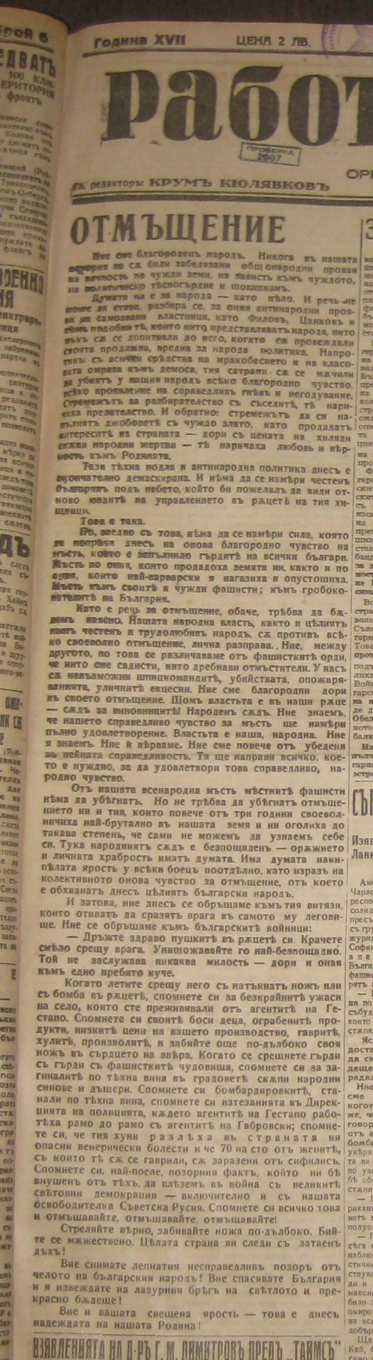 БСП пуснали пропаганден клип по телевизорите. Акцент се поставя върху „възмездието“… Прозвуча ми някак познато и се сетих за една публикация в „Работническо дело“ (днес „Дума“) от 25 септември 1944 г. Цитирам: