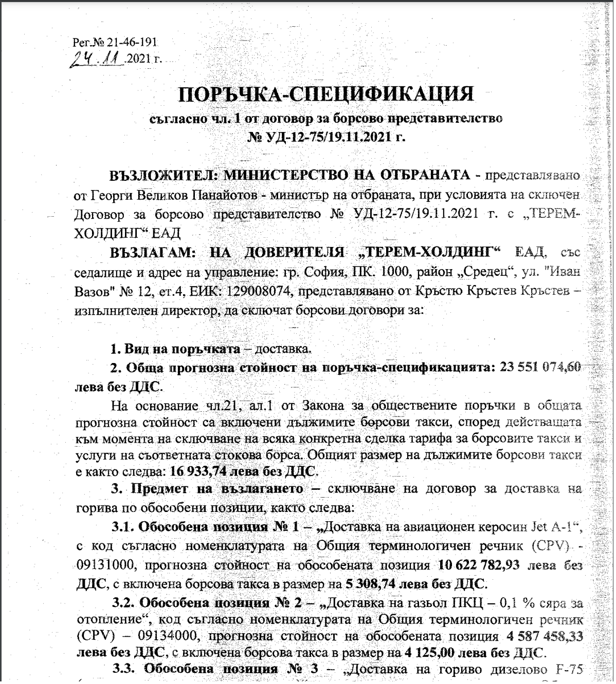 Защо на 24.11.2021 Панайотов сключва ин хаус договор с ТЕРЕМ за борсово посредничество за закупуване на горива за 23 млн. лв, при положение, че „Снабдяване и търговия – МО“ е лицензираният борсов посредник на министерството?