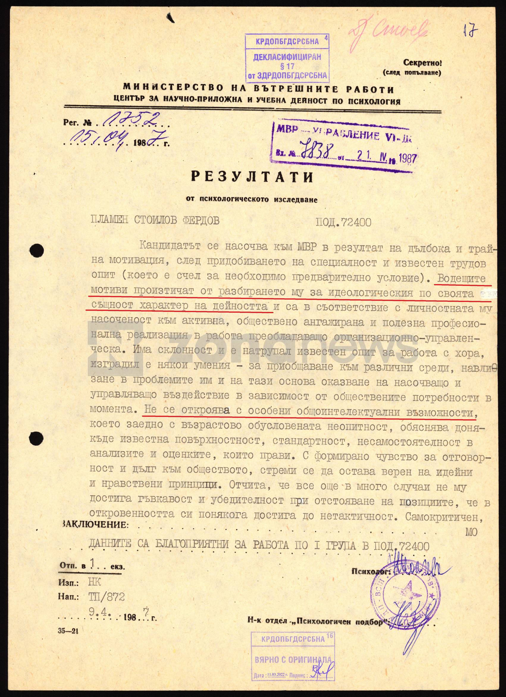 След като е извършено проучването му за работа в Държавна сигурност, от Центъра за научно-приложна и учебна дейност по психология на МВР представят резултатите от психологическото му изследване, където пише следното: