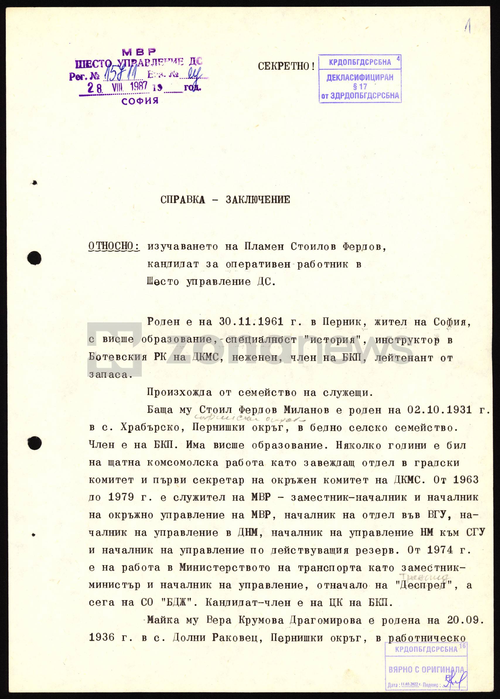 Държавна сигурност започва изучаването на Пламен Фердов през 1987 г. На 28 август с.г. проучването е завършено и е съставена т.н. „Справка-заключение“. От нея разбираме, че Фердов е роден на 30.11.1961 г. в Перник. Завършил е през 1979 г. 7-мо ЕСПУ „Г. Димитров“ в столицата успех 4,73!!! Запомнете този успех, той ще протече като червена нишка в заключението на психолозите от МВР преди да го приемат на работа в Шесто управление на ДС. В казармата е изпратен в НШЗО „Хр. Ботев“, където изкарва едномесечен курс за запасни политически работници в армията. На 19 години е приет за член на БКП.