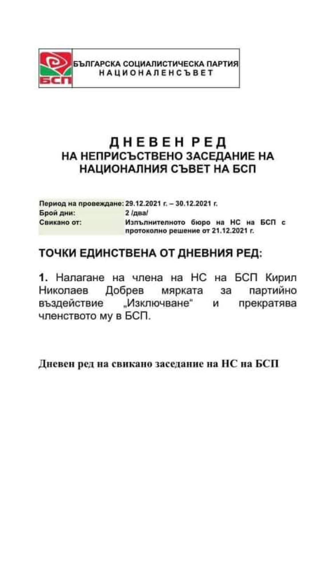 И ето: на 29-30 декември се свиква неприсъствено заседание на Националния съвет на БСП с точка единствена: “Налагане на члена на НС на БСП Кирил Николаев Добрев мярката за партийно въздействие “Изключване” и прекратяване членството му в БСП.”