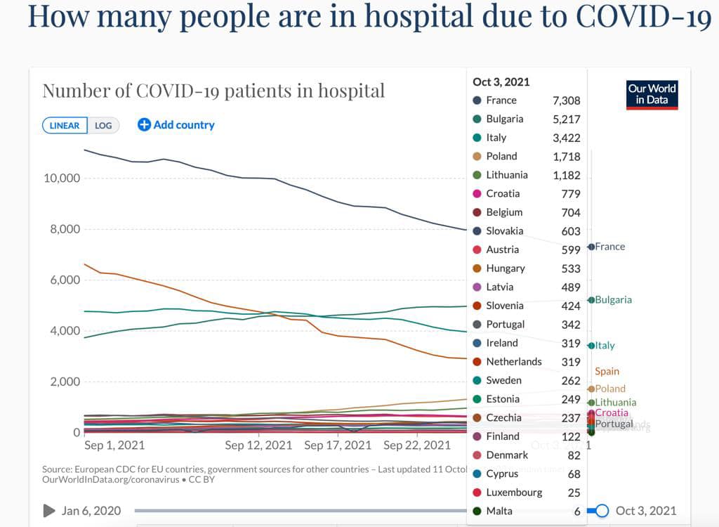 Данните в ourworldindata.org показват, че България е на второ място в Европа по брой хоспитализирани пациенти – 5505 в лечебни заведения и 472-ма в интензивни отделения. Пред България е само Франция (7300 души в болница), но тенденцията там е за намаляване на приетите в болница, докато при нас графиката показва ръст в последните седмици. Населението на Франция обаче е повече от 67 млн. души. Нашето – под 7 млн. души.