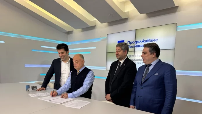 Лидерите на коалицията „Продължаваме промяната – Демократична България“ – Кирил Петков, Асен Василев, Христо Иванов и Атанас Атанасов, подписаха споразумение за общо участие на предсрочните избори за народни представители и изборите за членове на Европейския парламент.