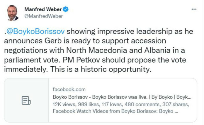 „Бойко Борисов демонстрира впечатляващо лидерство. ГЕРБ са готови да подкрепят преговорите за присъединяване на Северна Македония и Албания при гласуване в парламента“, написа Вебер.
