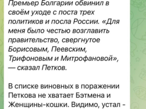 „Премиерът на България обвини за свалянето си от поста трима политици и руския посланик“, написа в профила си в телеграм говорителката на руското Външно министерство Мария Захарова.