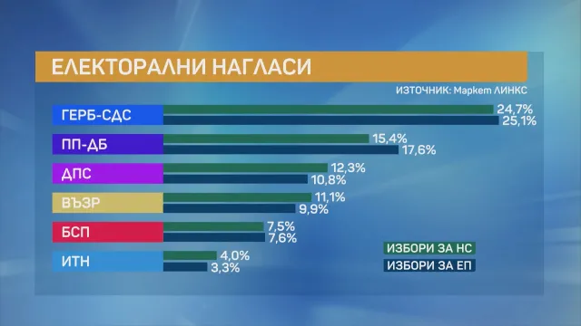 При гласуването за националния парламент на 9 юни ГЕРБ-СДС получават 24,7% от гласовете, а вторите ПП-ДБ – 15,4%. Това сочи национално проучване за електоралните нагласи, финансирано и реализирано съвместно от bTV и „Маркет ЛИНКС“.