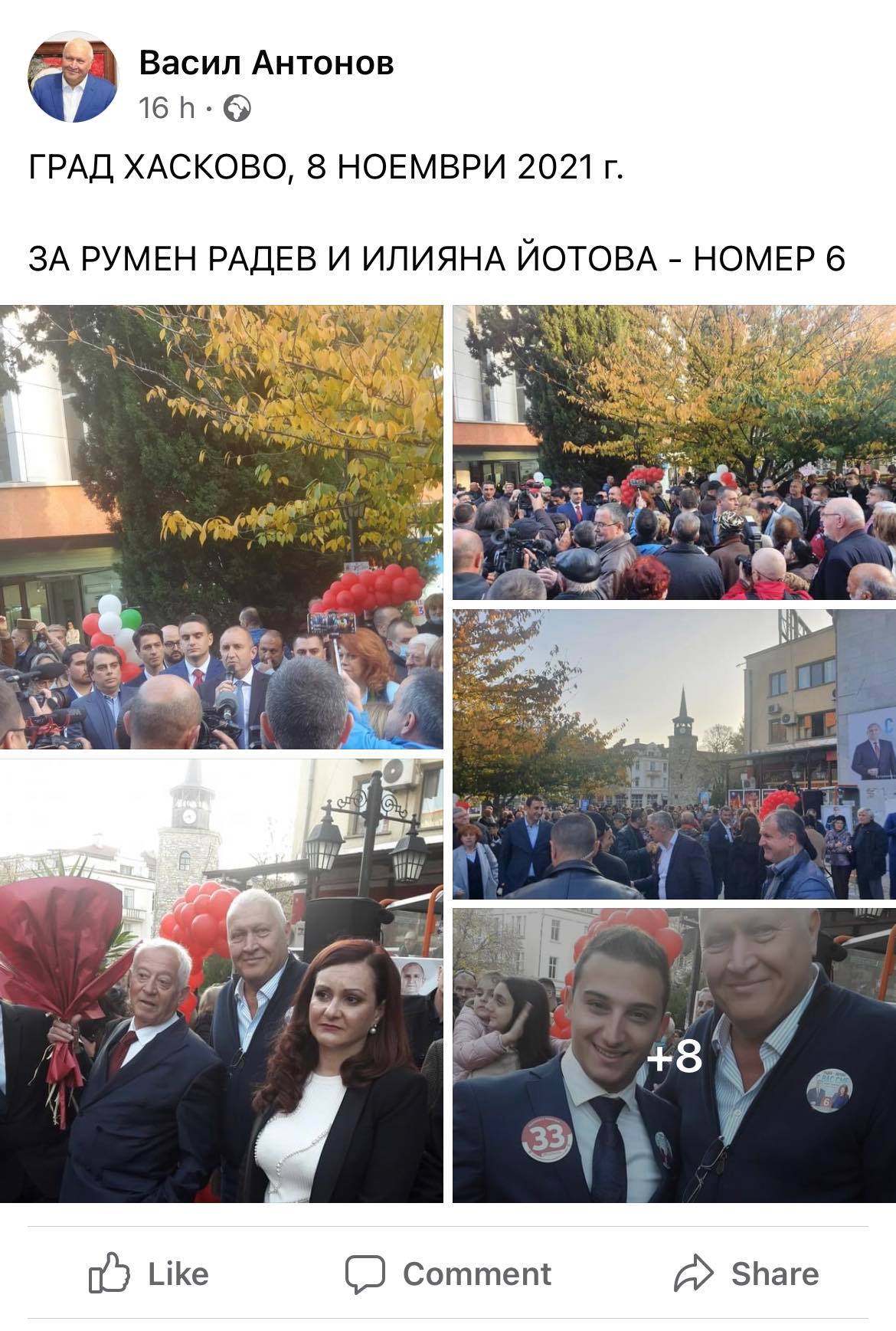 Това се потвърждава от самохвални постове в социалните мрежи на шефа на БСП в Плевен Васил Антонов, който се оказа… посрещач на предизборната среща на Радев… в Хасково.