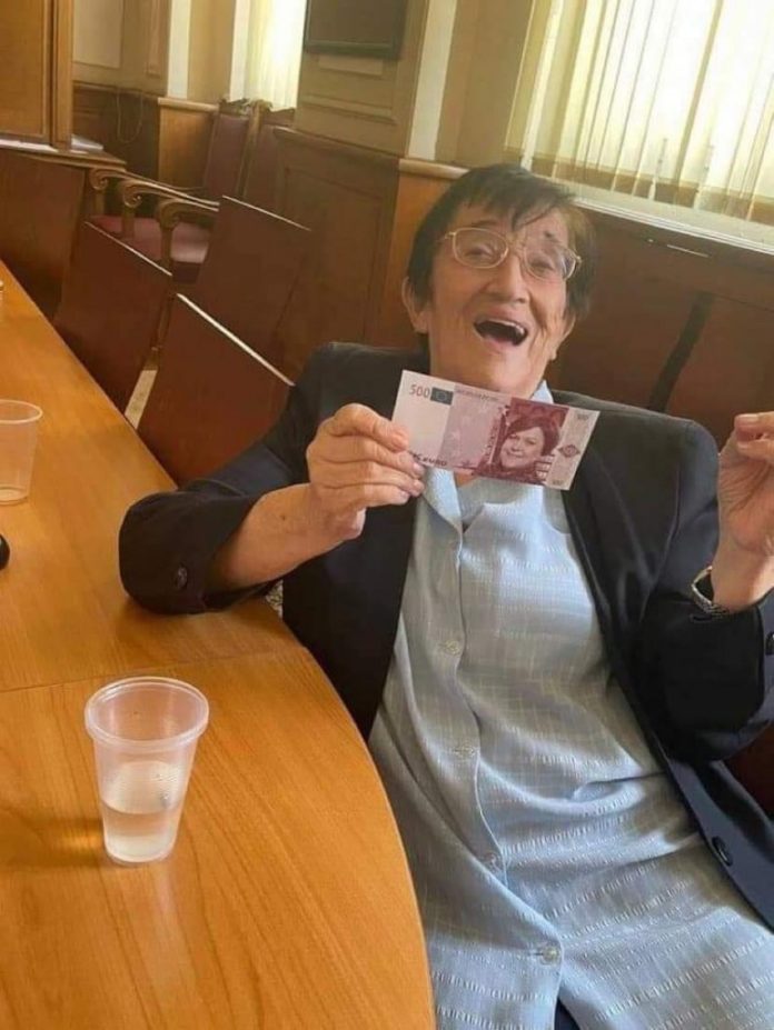 Депутатката Мика Зайкова се забавлява с банкнота от 500к с лика на Татяна Дончева.