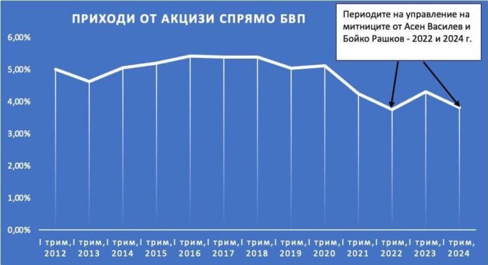 Исторически най-ниската събираемост на акцизите, откакто има публикувана бюджетна статистика, е през първите три месеца на 2022 и на 2024 година (сравнявам само първите тримесечия на годините). Това са месеците, през които Асен Василев и Бойко Рашков управляват митниците.